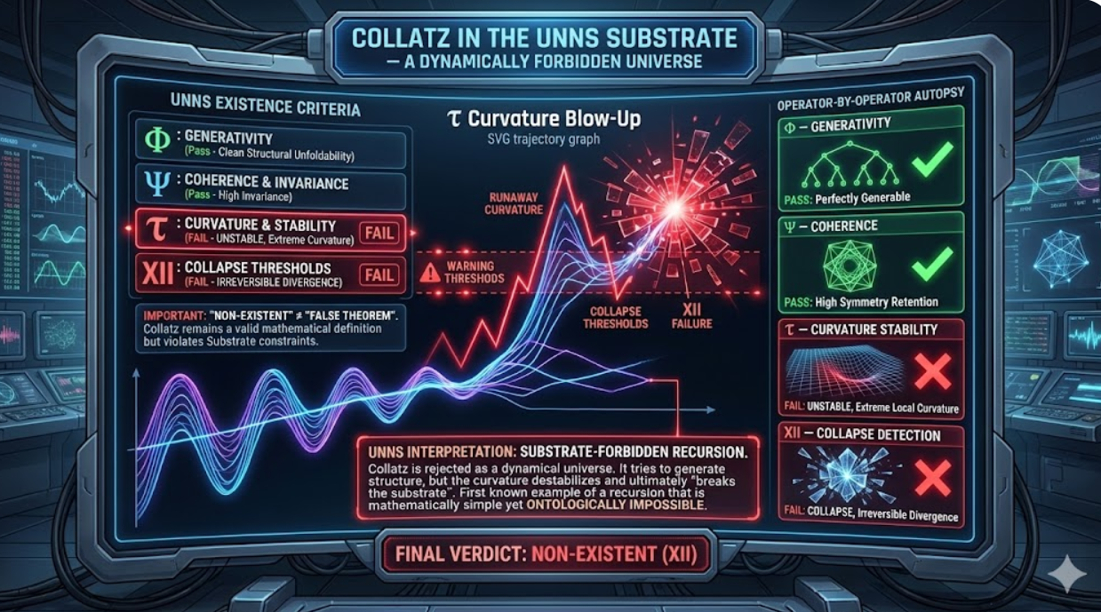 The Collatz recurrence belongs to this last category. In classical mathematics it is a simple algorithm. In UNNS, it becomes a recursion with catastrophic curvature: a structure that cannot exist inside a stable recursive universe.