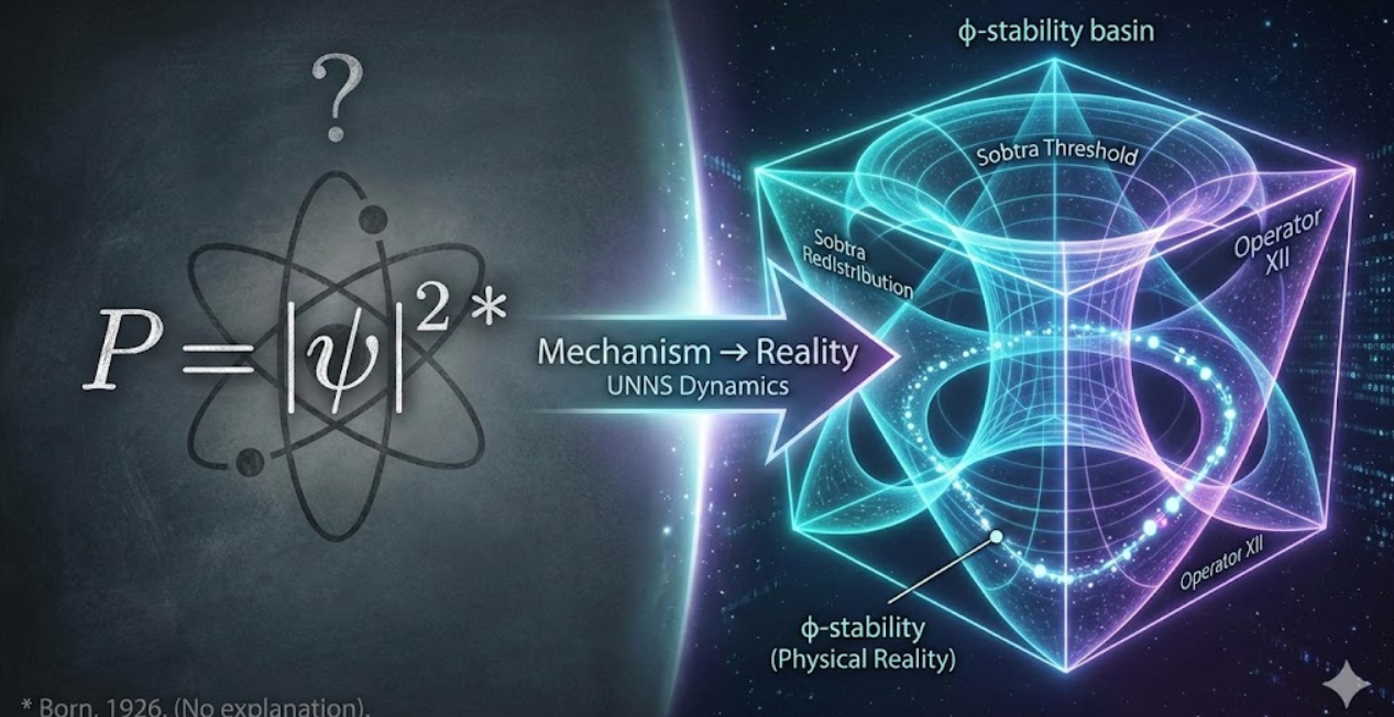 In UNNS, this historical oddity becomes completely natural. Classical QM lacked Sobra thresholds, Sobtra redistribution, Operator XII collapse, and φ-recursion geometry — therefore the |ψ|² rule had to be “inserted” by hand.