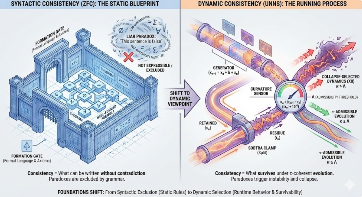 In classical set theory, “consistency” is largely a property of an axiom system and its formal language: what can be written, and what can be proved without contradiction. In UNNS, “consistency” is also a property of behavior: what survives under recursion, what remains admissible under τ-thresholds, and what collapses.