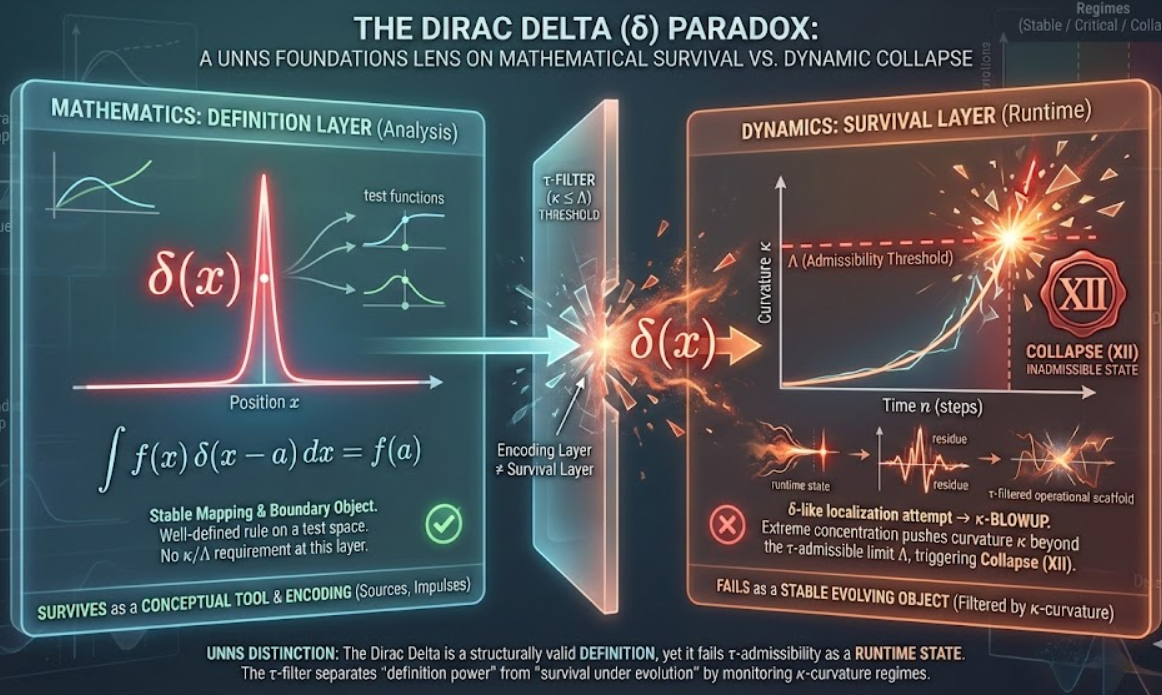 A UNNS foundations lens: δ(x) is structurally valid as a limit-object, yet it fails τ-admissibility as a runtime state. This article separates “definition power” from “survival under evolution” using κ-curvature, Λ thresholds, and Collapse (XII).