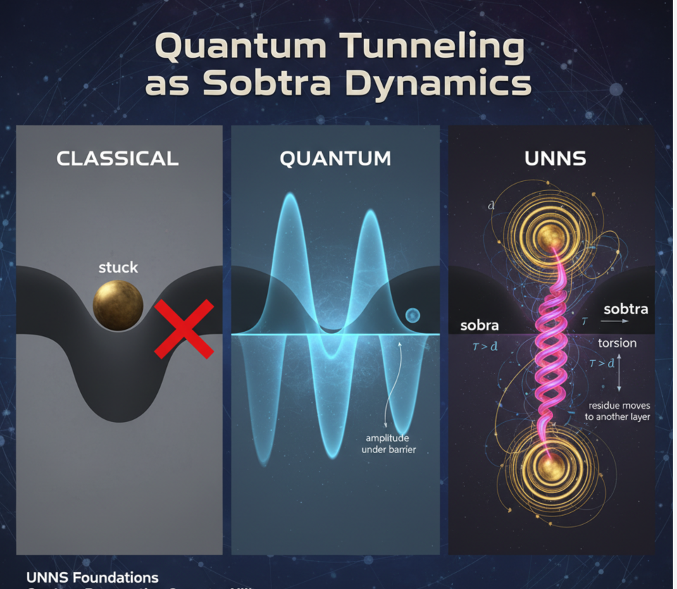 What classical physics forbids, quantum mechanics allows. In the UNNS substrate, this “impossibility” becomes a clean structural rule: tunneling happens when Collapse chooses the sobtra channel instead of sobra.